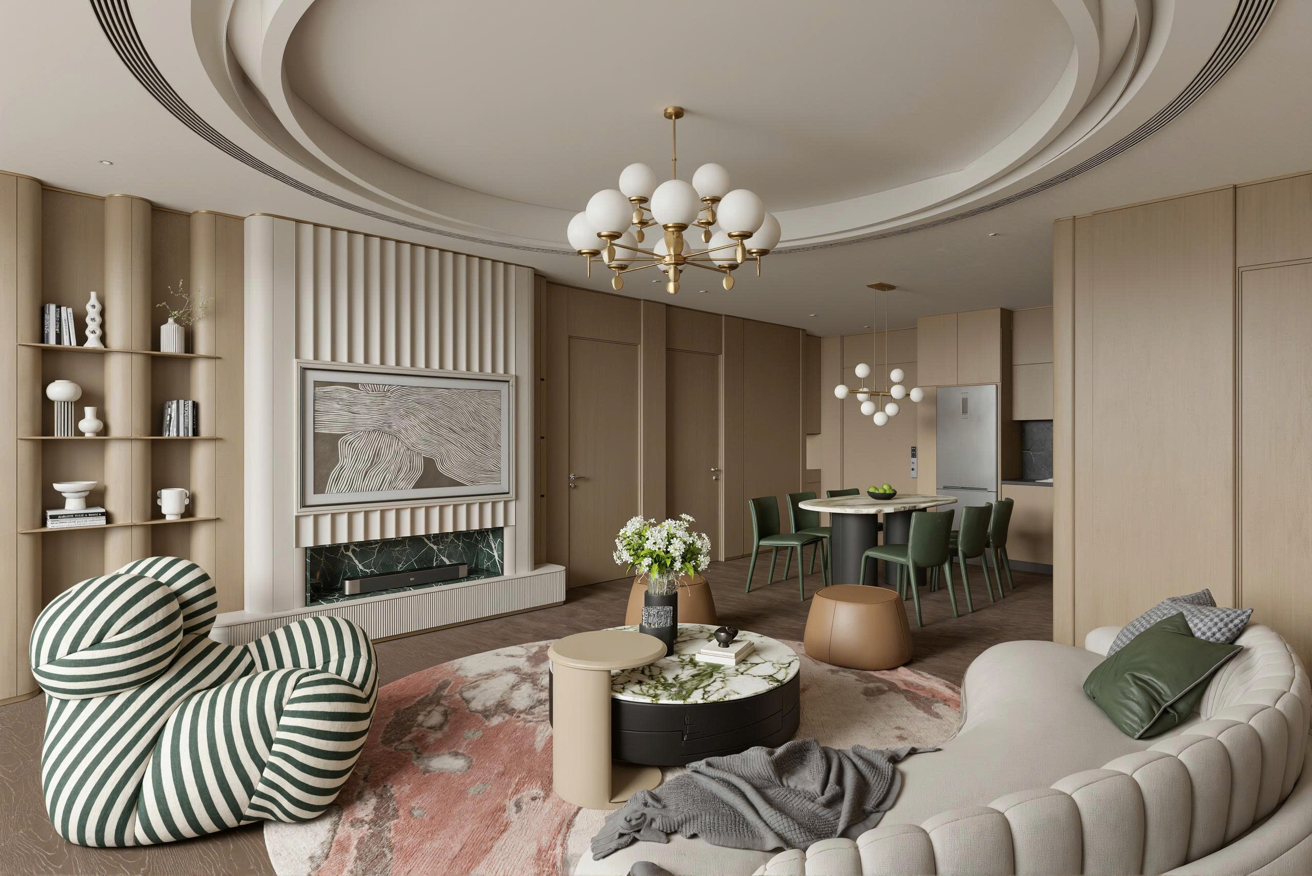 Đặc điểm: Không gian sống rộng rãi, đẳng cấp với khu vực bếp và phòng khách liên thông, tạo sự kết nối cho các thành viên trong gia đình.