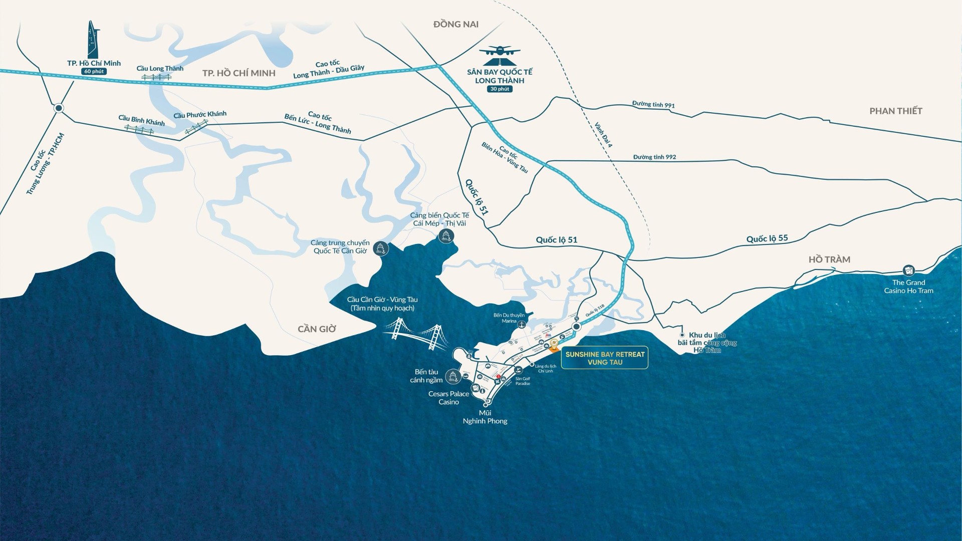 Sunshine Bay Retreat sở hữu vị trí “kim cương” ngay mặt tiền bờ vịnh, nơi giao thoa giữa làn nước xanh ngọc bích và dải cát trắng mịn màng. Tọa lạc tại tâm điểm kết nối du lịch nhưng vẫn giữ được sự biệt lập cần thiết, dự án mang đến tầm nhìn hướng biển không giới hạn, giúp cư dân dễ dàng tiếp cận các tiện ích ngoại khu hiện đại chỉ trong vài phút di chuyển.