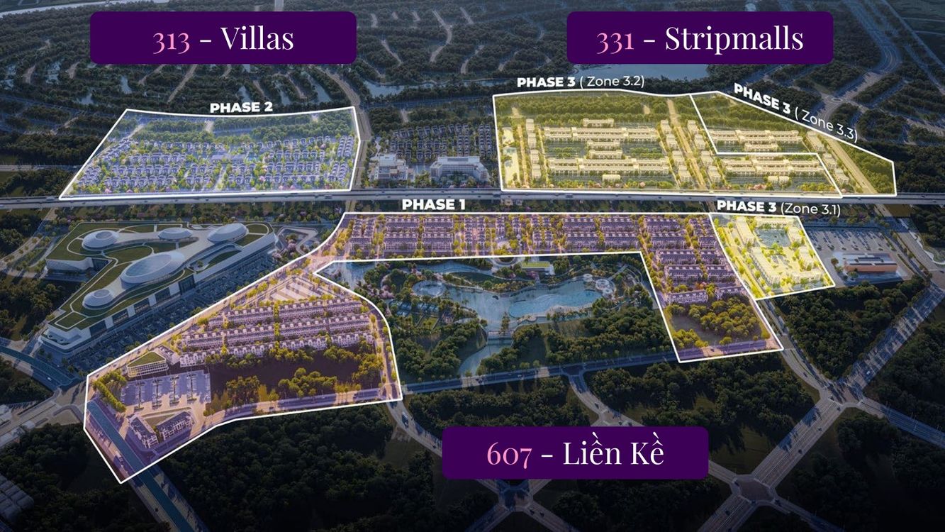 | Tiện ích: | Đại siêu thị Mega Mall 9.5ha, Hồ bơi nổi trên hồ 3.300m² (Đầu tiên tại Việt Nam), Quảng trường & Sân khấu nhạc nước ngoài trời 1.2ha, Resort trị liệu cao cấp. |