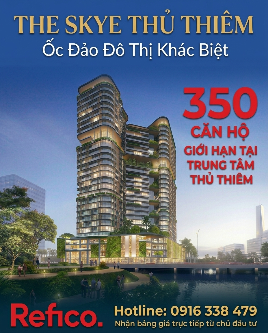 The Skye Thủ Thiêm là dự án căn hộ cao cấp tại trung tâm Khu đô thị Thủ Thiêm, TP. Thủ Đức. Dự án do Refico phát triển, nổi bật với thiết kế hiện đại, tầm nhìn sông Sài Gòn và kết nối nhanh đến Quận 1.